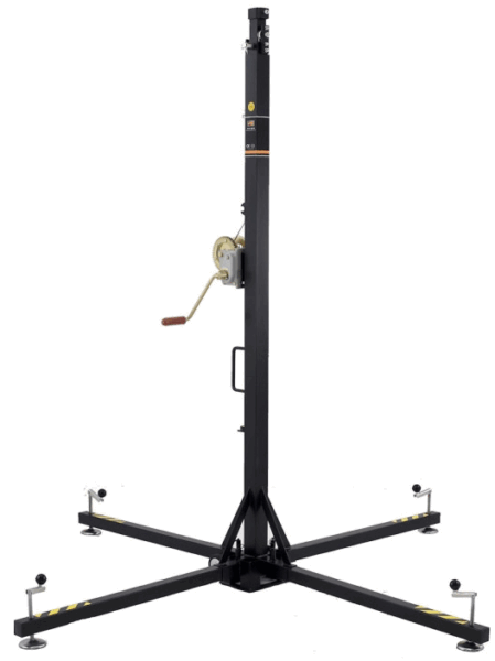 Der seilzugangetriebene Teleskoplift aus Cadmiumstahlprofilen ist mit automatischer Lastdruckbremse ausgestattet. Am Mastfuss sitzen drei abnehmbare Auslagestützen. Rutschsichere Auflageflächen der Stützen sorgen für hohe Standsicherheit. Ein überdimensionierter Sicherheitsbolzen hält das innere Mastelement in der gewünschten Arbeitsstellung fest, so dass das Seil lastfrei wird. Ein absacken der Last wird dadurch verhindert. In Transportstellung ist der Mast eingezogen und die Stützen befinden sich in ihren Aufnahmen. Dadurch wird das Gerät kompakt und ist sehr einfach zu transportieren. Vermietung inkl. Trussadapter.
